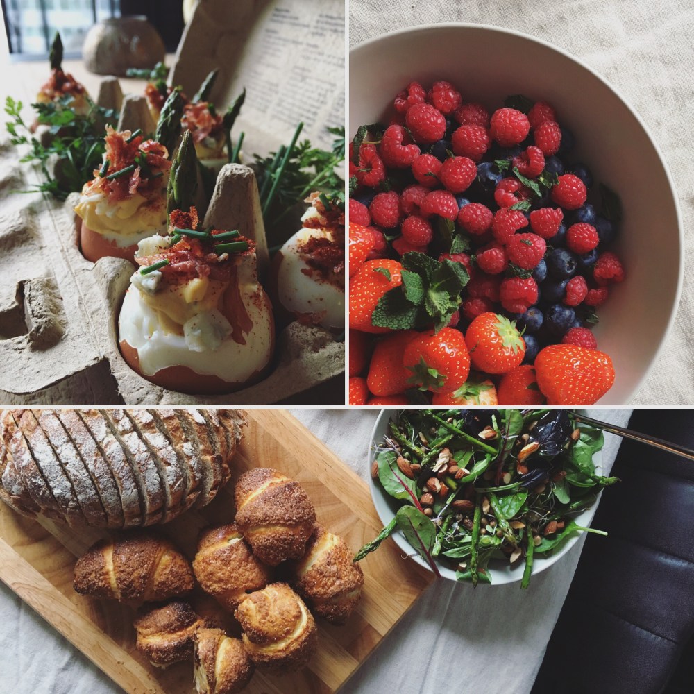 Obviously I’d like to treat myself on something guilty on these festive days, but to balance the brunch from the runny banana chocolate croissants I also made a healthy salad (with black eyed peas, almonds, micro greens, lemon-y dressing and left-over asparagus), served with crusty rye bread (yes, my favourite Liefde & Passie bread!) a berries fruit bowl, and these beautiful asparagus deviled eggs. Doesn’t it look awesome?!